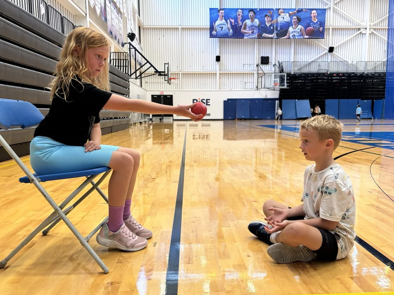 Each partner group will have one beach ball, a hula hoop, and 3 boccia balls or bean bags each.