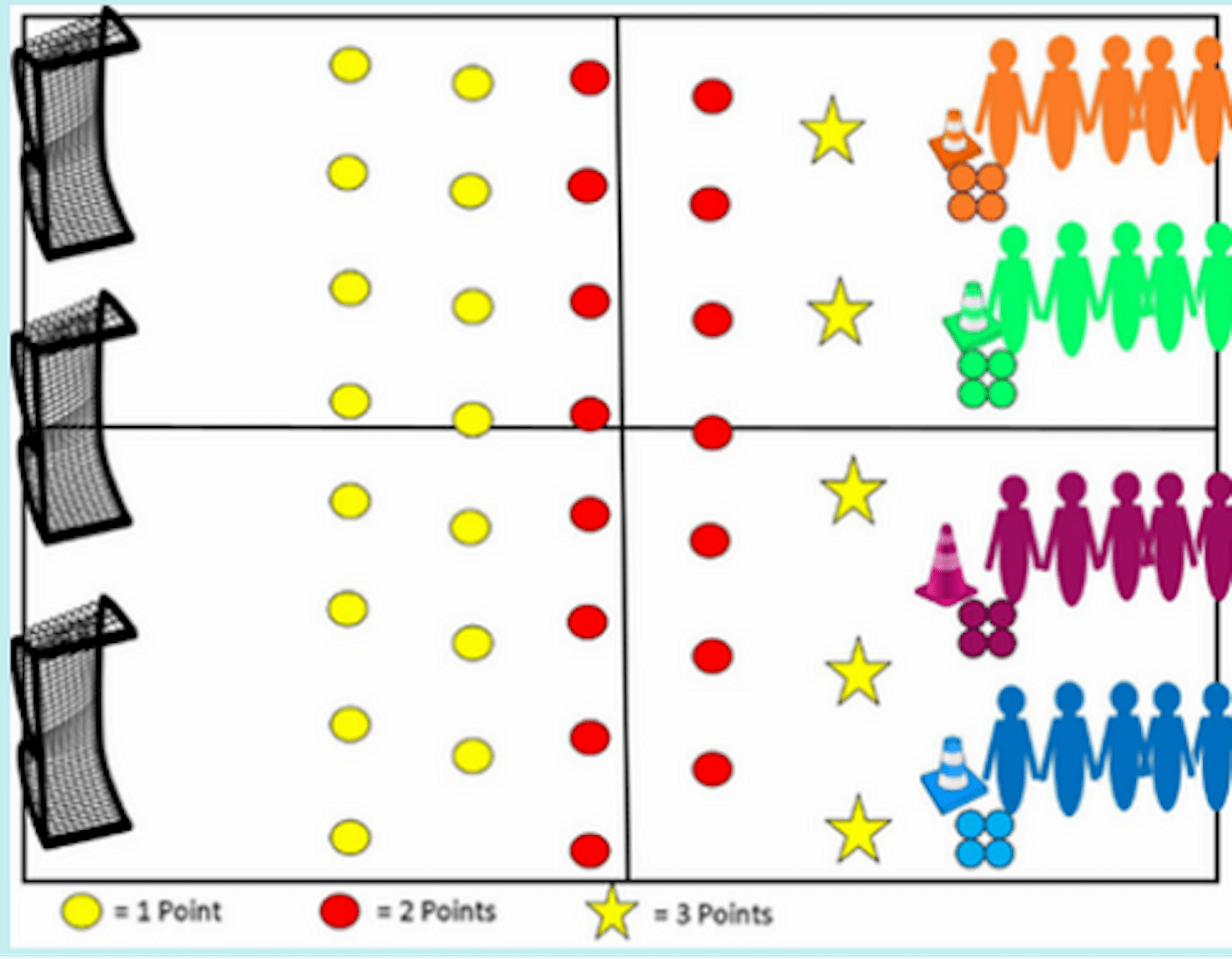 Players move their ball around the course, completing skills such as dribbling, stopping, and shooting as they go.